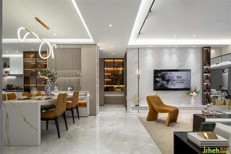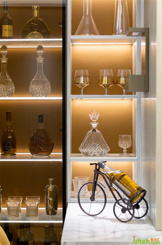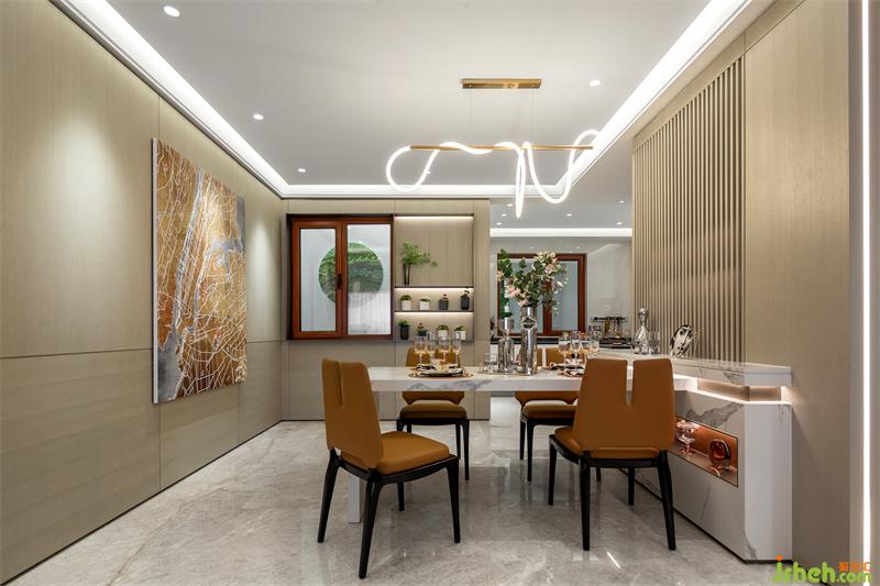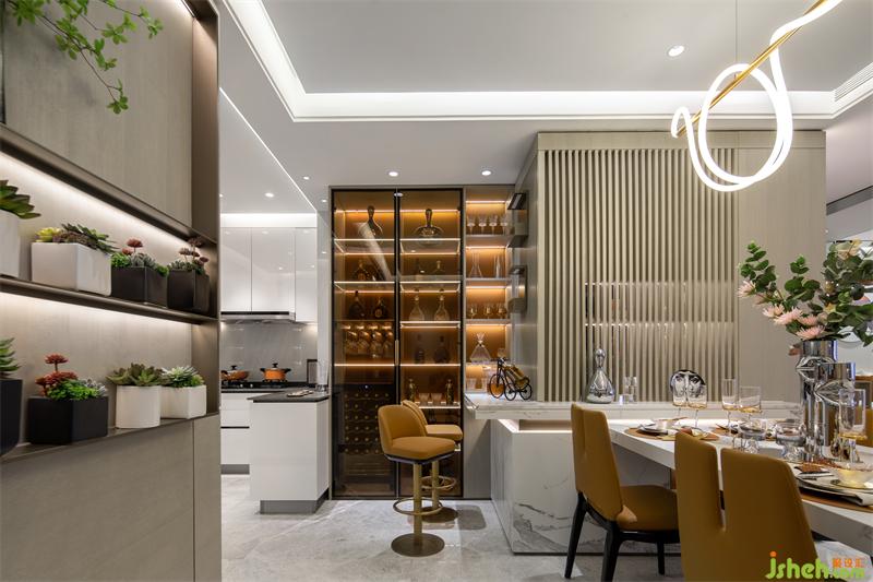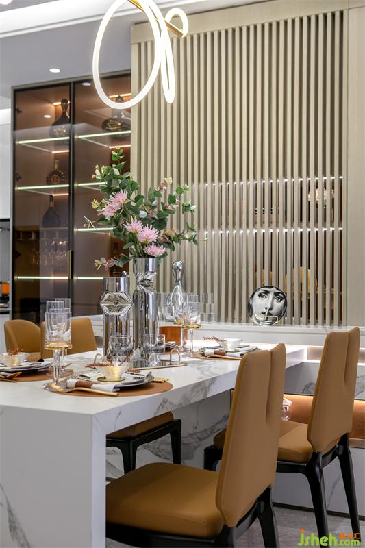 餐廳我們選用橙色系的餐椅和白色大理石餐桌加以搭配,在整個淺色調(diào)的空間下,就餐區(qū)的功能和感受尤為深刻。樣板間設計極具現(xiàn)代簡約風格的吊燈,將線條感表現(xiàn)到了極致。餐廳酒柜區(qū)收藏著男主人到世界各地旅游收集的美酒與酒文化相關的書籍,充分體現(xiàn)了男主人的高尚生活品質(zhì)。