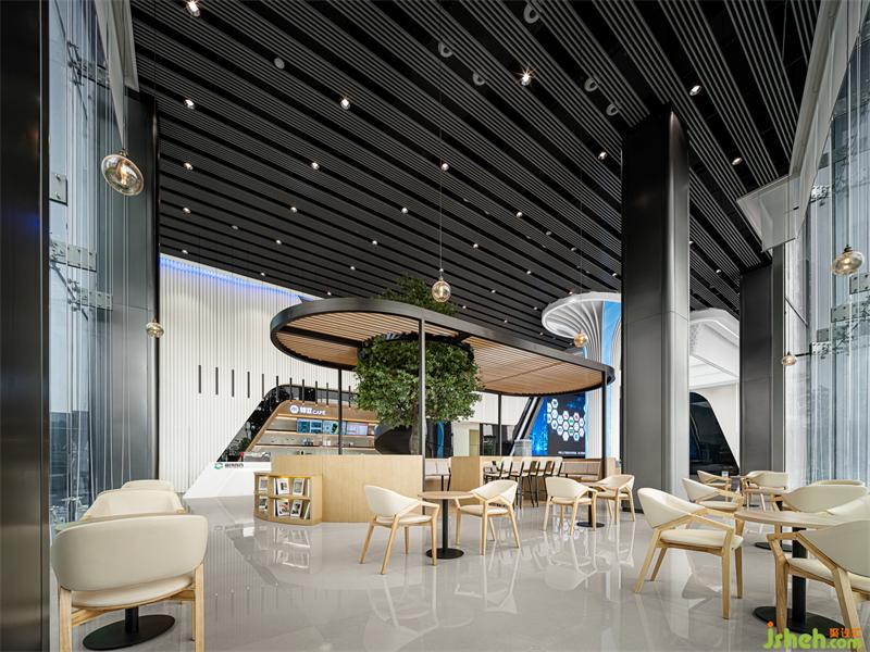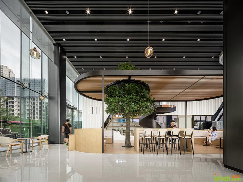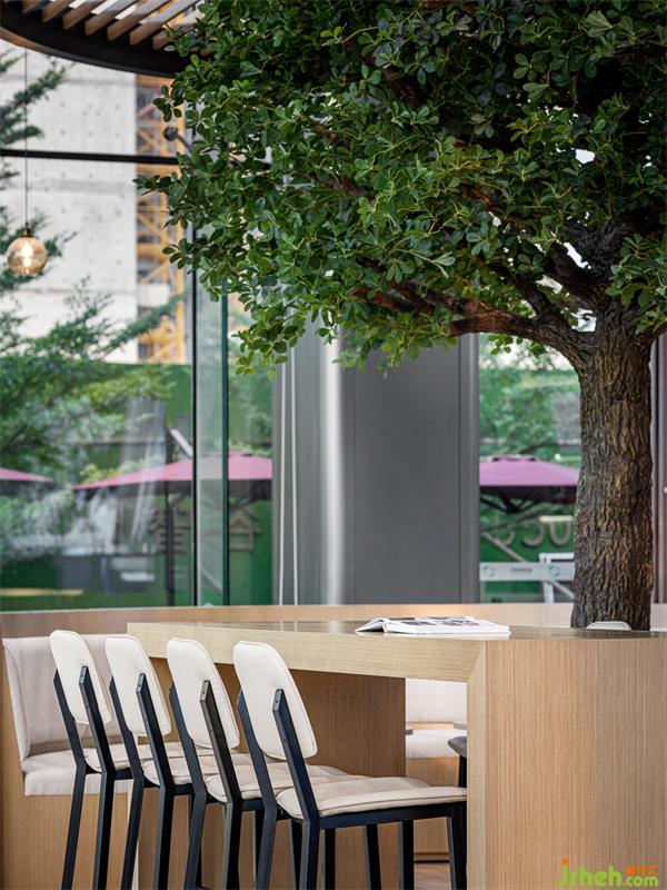 我們置入“森林盒子”的概念,作為創(chuàng)客咖啡區(qū)隔斷和功能的分區(qū),盒子內(nèi)部設(shè)置了一棵“自然之樹”,營造輕松愜意的空間氛圍,輕盈有趣,將空間的功能性與觀賞性完美結(jié)合。