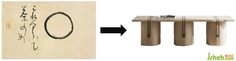 主臥床尾凳的樣式取形仙厓畫作《一圓相畫贊》中的圓相,圓相指真理之圓滿與絕對。家具制作上舍去不必要的裝飾和壯碩的結(jié)構(gòu),一切設計都化繁為簡,充分體現(xiàn)出簡素、空靈、寂靜的禪宗理念。