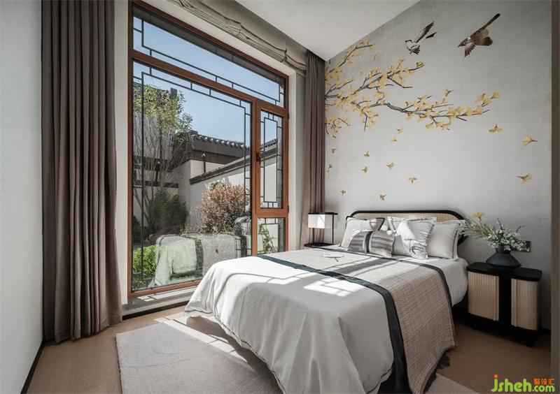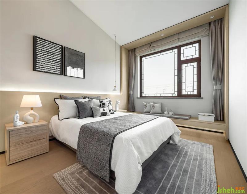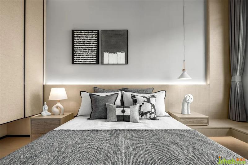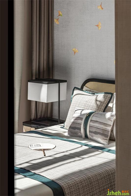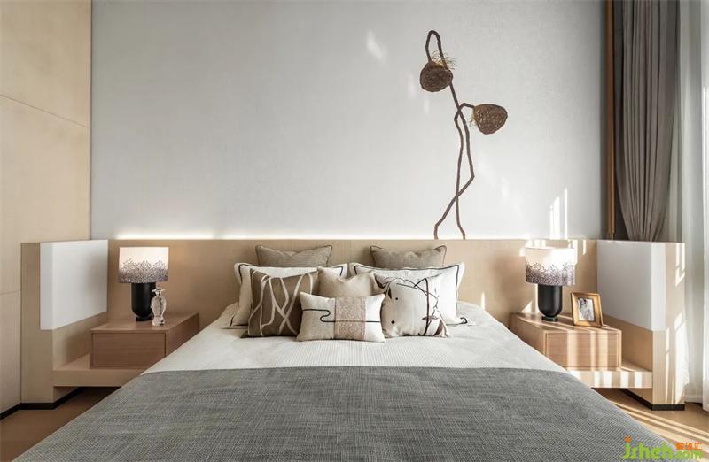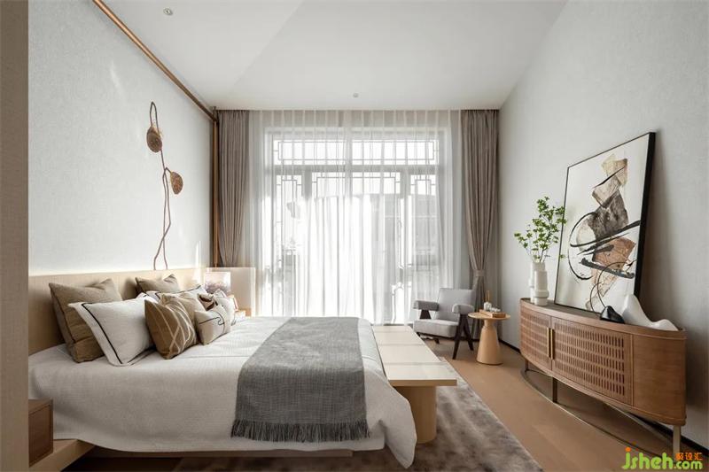 獨具藝術(shù)特色的“蓮蓬”以曲折的形態(tài)蜿蜒生長;樣板間設計采用留白形式鋪陳展開,帶有一縷淡然、清凈的神韻。主臥保持自然的色彩,床品與地毯以飽和度低的顏色點綴,帶來一股萬物的寧靜與自然的和諧氣息。