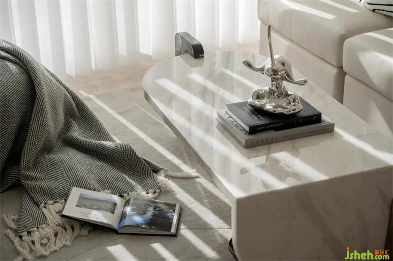 溫潤平滑的大理石茶幾,樣板間設(shè)計(jì)造型獨(dú)特的凳子與黃色波點(diǎn)蘋果擺件打破空間的常規(guī),調(diào)適安然的色調(diào),凸顯出舒適與自由,沉穩(wěn)又不失自然靈動。主人公在客廳空間里,無論是溫茶咖啡細(xì)品的悠閑自得,還是游戲追劇粗獷的閑情逸趣,都是舒適的放松體驗(yàn)。