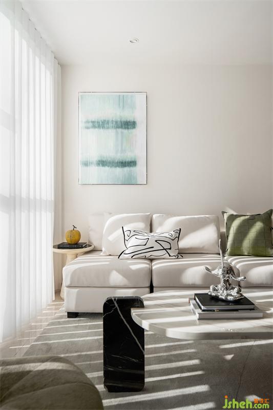 充滿陽光和清風(fēng)的早晨,開啟美妙的一天,起身開窗,與陽光和清風(fēng)撞了個滿懷。溫暖的米白色融入清新的草綠色,像一杯抹茶拿鐵,清新味道中融入了幾絲奶香與甜味,灑入室內(nèi)的陽光,留存一室溫暖。小小的一方空間成為主人公難得放松與寧靜的一隅天地,享受著溫暖的愜意,洗去一身煩惱。