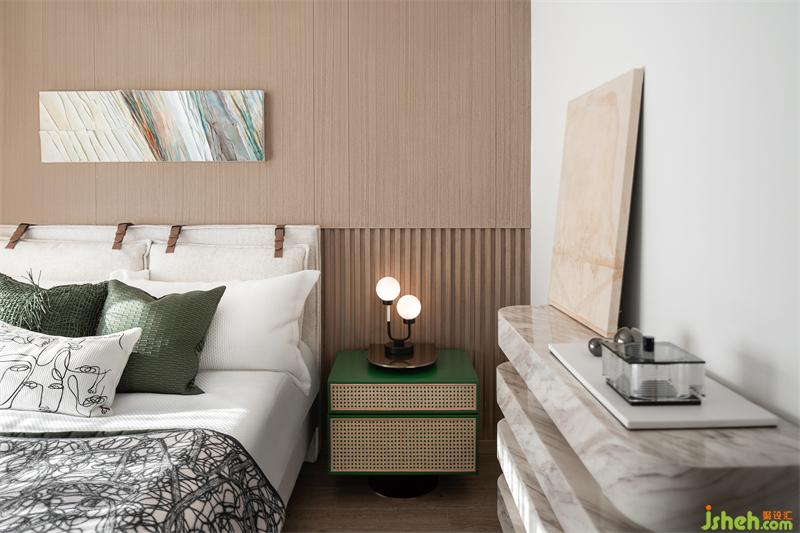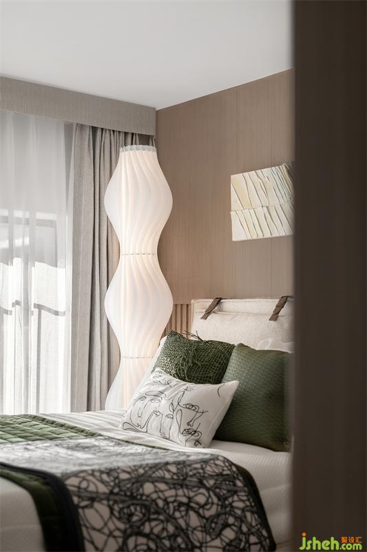 二層主臥通過簡約的木質(zhì)基調(diào)進(jìn)行空間架構(gòu),摒棄繁復(fù)的裝飾是一種自由的觀感,在某種意義上,保證了空間的整體舒適感,曲線造型落地?zé)襞c抽象畫相呼應(yīng),綠色床品與精致藤編床頭柜的裝點豐富了空間的層次,在日光的映射下充滿靈動與秩序感。