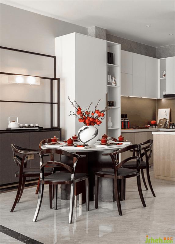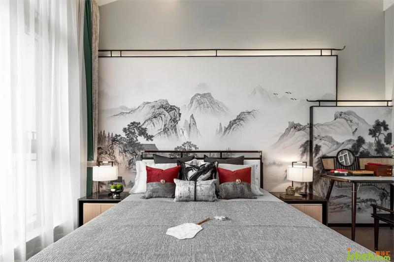 文人雅士的核心審美特點是“雅趣”,“雅”作為一種審美標準和設計思想貫穿于明代家具設計之中。家具線條直與圓弧結(jié)合,也是文人的傲骨之氣與婉約之風的體現(xiàn)。主臥配色清雋風雅,溫和的白與灰中庸地包容空間內(nèi)每一個細節(jié)。一簇燈火,一簾光影,深淺不一的紅點綴在空間各處,樣板間設計盡顯明代的古意與詩韻。