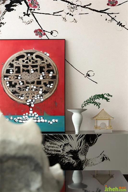 明代官吏常服盤領袍,胸前和后背綴有一方補子,區(qū)別品秩,孔雀是其中之一,樣板間設計運用到電視柜上,水墨寫意,雅逸清俊。明朝給丹頂鶴賦予了忠貞清正、品德高尚的文化內(nèi)涵。結(jié)合這一元素運用到軟裝的地毯上,灑脫秀逸,閑庭信步。