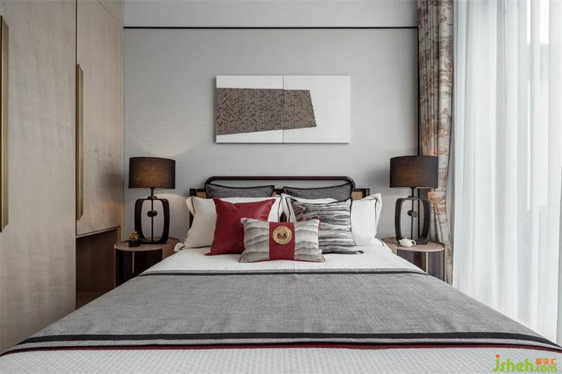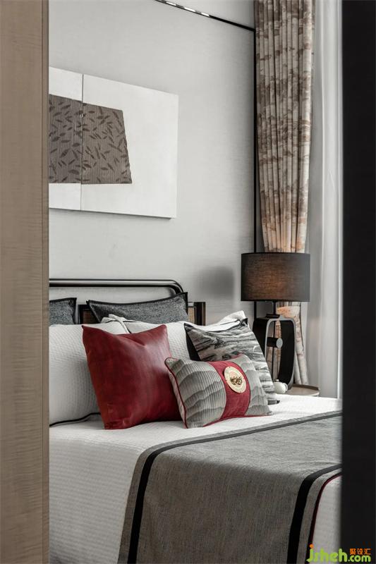 父母房以奢雅與自然的靜美達到了平衡舒適的境地,金屬與棉麻的配搭,紅色與灰色的碰撞,賦予了居者感官上的便利與享受。