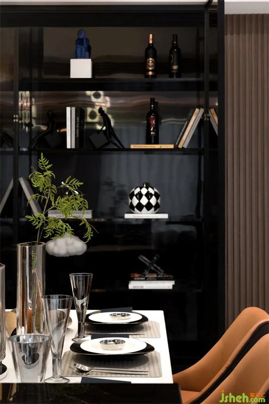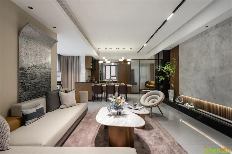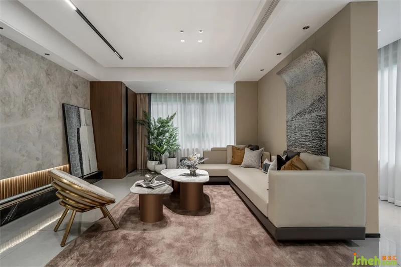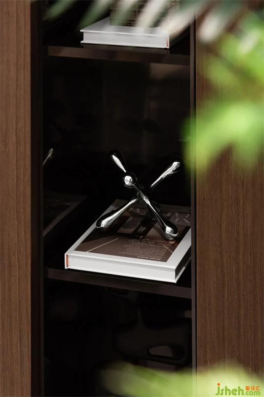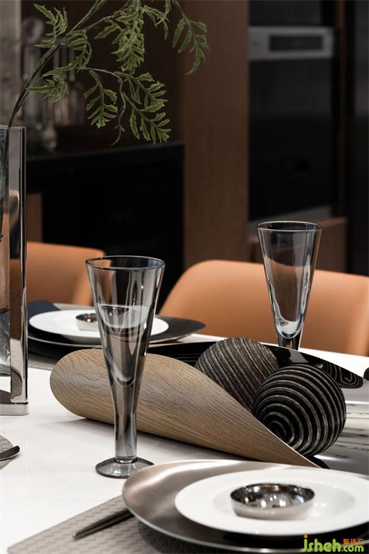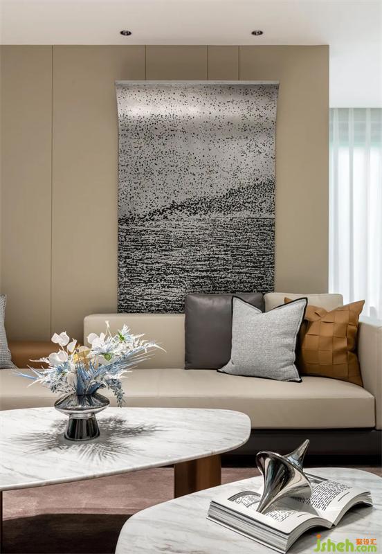 客廳是親友間情感交流的趣味互動區(qū)域,同一空間中的不同狀態(tài),情感在傳遞。一縷陽光闖入到室內(nèi),讓主人們沉浸在陽光的洗禮中??蛷d背景墻裝置為不銹鋼材質(zhì),金屬雕刻、人工鍛造、高溫著色。樣板房設(shè)計(jì)在抽象與表現(xiàn)、隱藏與揭示之間取得平衡。它們捕捉運(yùn)動與靜止之間的詩意時(shí)刻,同時(shí)給人以重量和輕盈的印象。