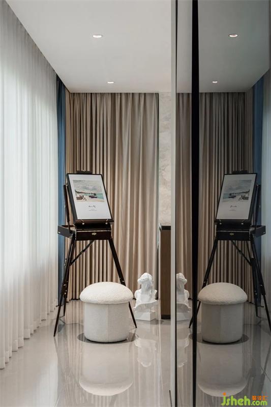 微風掀起窗紗一角,書房外的光景偷偷灑進來,樣板房設計與室內(nèi)的燈光交輝相映,拿起桌上的畫紙,一筆一畫描摹著生活的藝術和細節(jié)。
