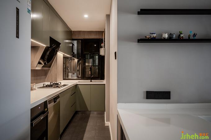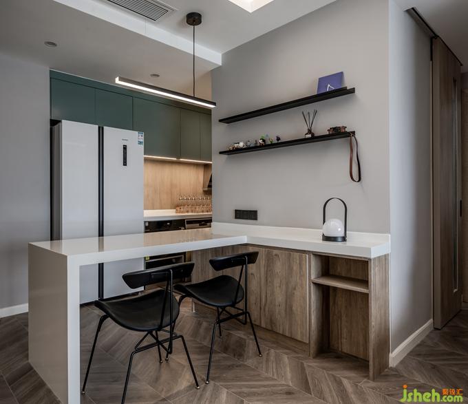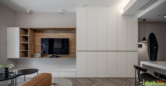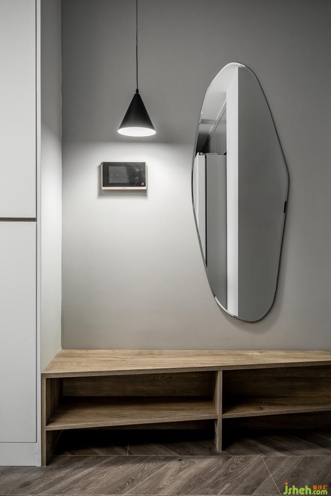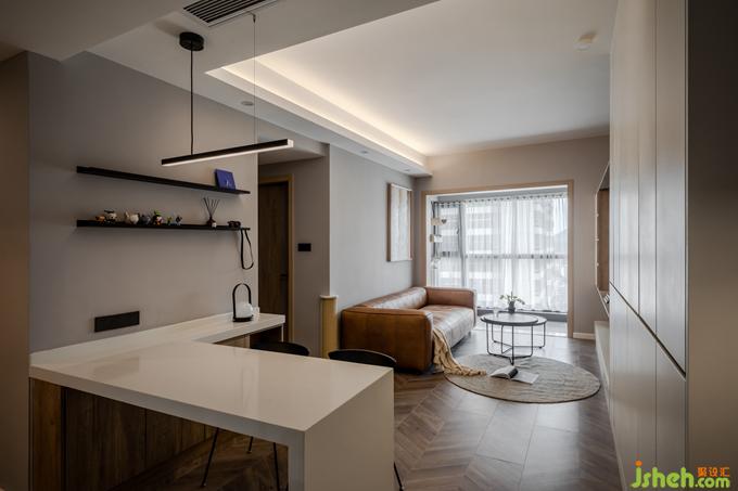 客廳的布置簡單干凈,暖灰色墻體搭配原木色電視柜,室內(nèi)設(shè)計師一組沙發(fā)+橢圓茶幾,日常坐在地毯上,靠著沙發(fā)看劇,擼貓,或在茶幾上進(jìn)食,一個人的生活,便能如此隨性自由。電視柜的設(shè)計增加了客廳的儲物功能,拉平了客餐廳墻體,從客廳看室內(nèi)過道,將公共空間連成一體,相互呼應(yīng),擴大空間視覺感。