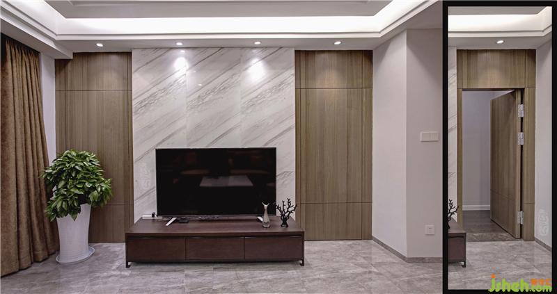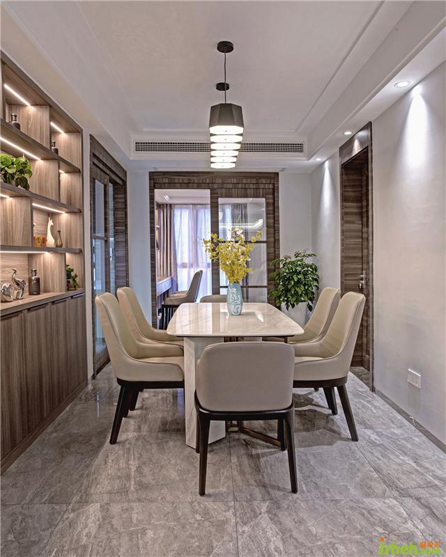 前提滿足生活陽臺的功能性同時,而選擇擴大客廳空間,重點營造整個公共空間視覺感??蛷d電視背景隱形門設(shè)計起到虛實的不斷變化,也滿足業(yè)主心理需求——見和不見??蛷d以爵士白大理石和原木飾面建立一個質(zhì)樸安寧的素雅居住氛圍,達到一種更接近與內(nèi)心自我、更接近天然的狀態(tài)。自然采光略少的餐廳,采用了更為利落、輕盈的手法,與客廳形成明顯的空間跳躍感。體量不小的邊柜,將一切餐用有序地歸納、整潔。