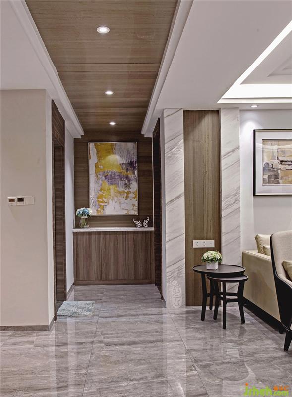 一進門,由于頂部木質(zhì)造型延伸性的引導(dǎo),首先引入眼簾的,便是樸素自然的木質(zhì)端景??紤]入戶收納功能,旁側(cè)酒柜與鞋柜的一體化設(shè)計,讓居住者在進門處就能提高自己的便利性。