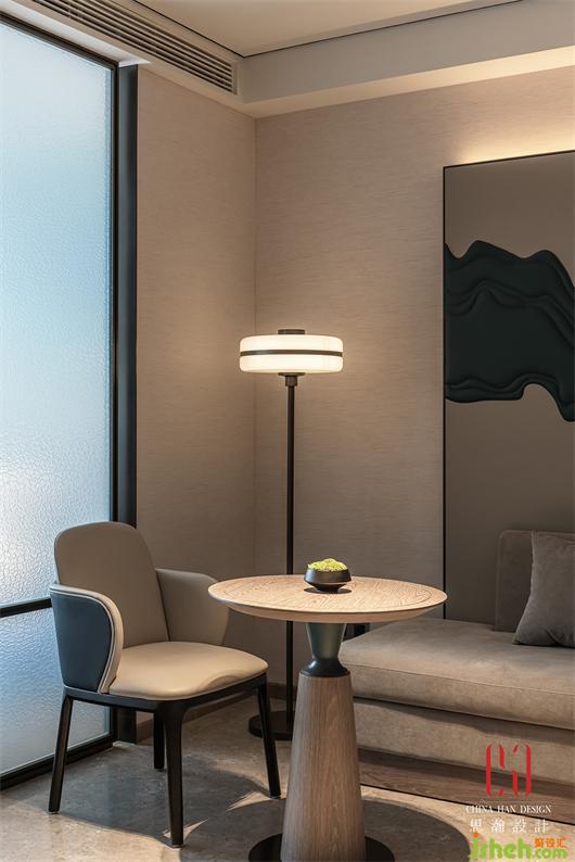 大堂吧臺的對面是茶室,在石材與燈光的浸潤中,茶室空間溫暖而明亮,阜陽酒店設(shè)計組合出空間舒然而悠閑的氛圍感。天花裝飾為無數(shù)輕靈的鳥兒,一側(cè)的裝飾墻,其內(nèi)提取了潁州竹林的元素,對景處的背景墻揉入了潁州西湖波浪的起伏感。