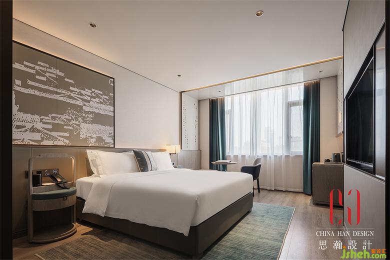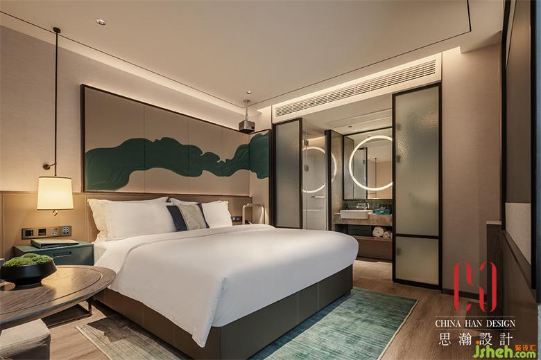 大床房選用中性灰色作為基調(diào),朦朧的玻璃彷如湖面,欣欣然的碧琉璃色,使空間更顯年輕活力,點(diǎn)染出西湖之春的氣息。
