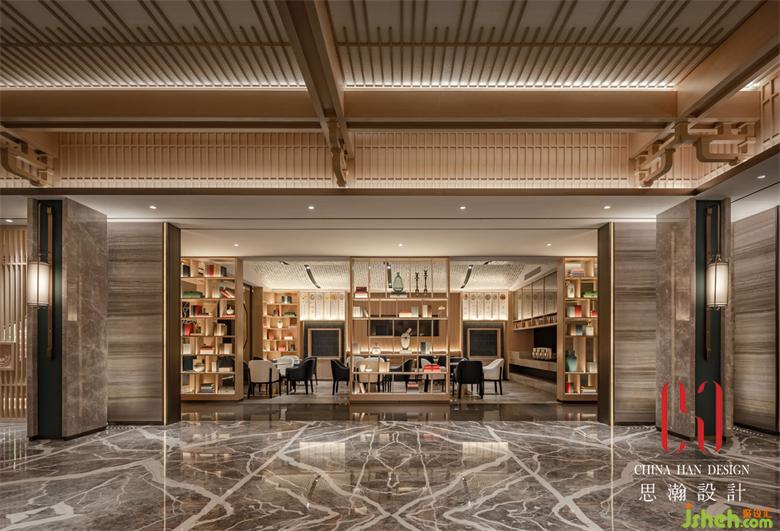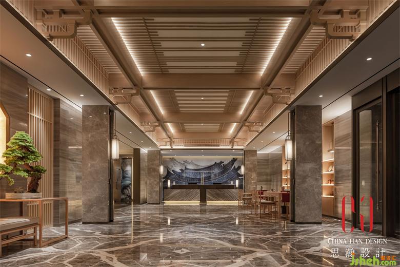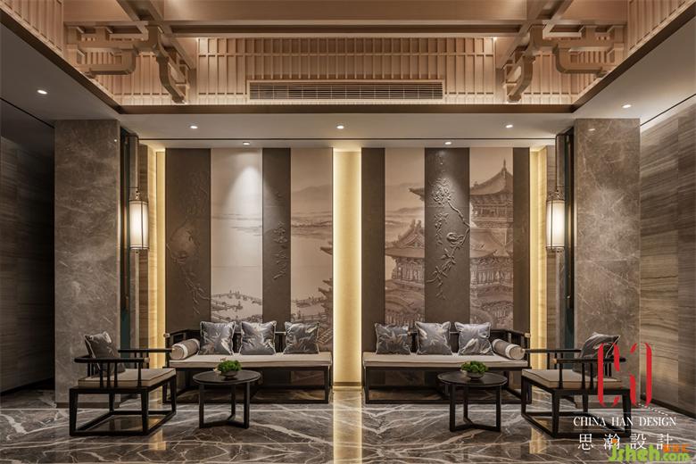 迎賓大堂由緊靠大門的換鞋區(qū),中間過渡的茶藝區(qū)以及前臺(tái)接待區(qū)組成。