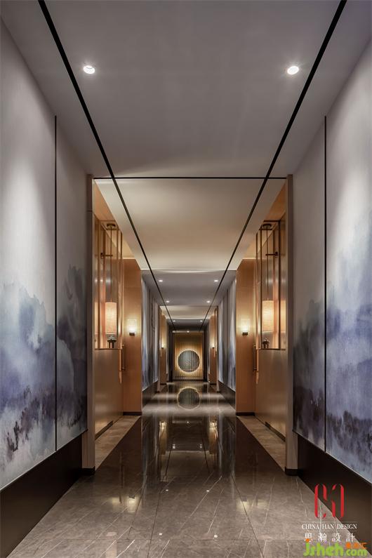 四平八穩(wěn)沿中軸對(duì)稱的大堂配備了茶藝臺(tái)和接待前臺(tái),足夠長(zhǎng)的入戶尺度和輕松的氛圍,給客人以安全感和私密感。