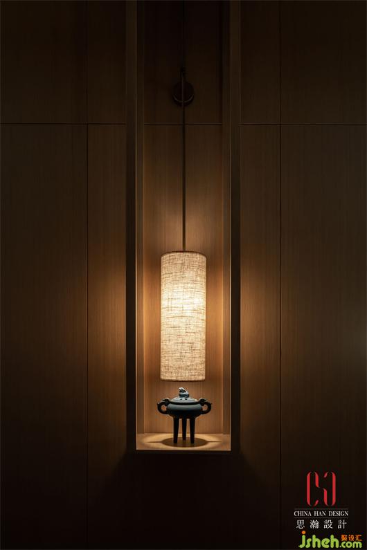 行走于水墨之中,端景的月洞門仿佛不僅是空間的結(jié)束,而是另一個(gè)延伸空間的起始,兩側(cè)房門前的羊皮燈與香爐裝置,在燈光與香味的暈染中,空間的質(zhì)感盡顯。
