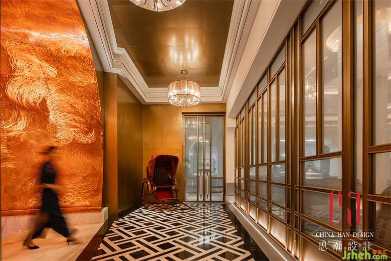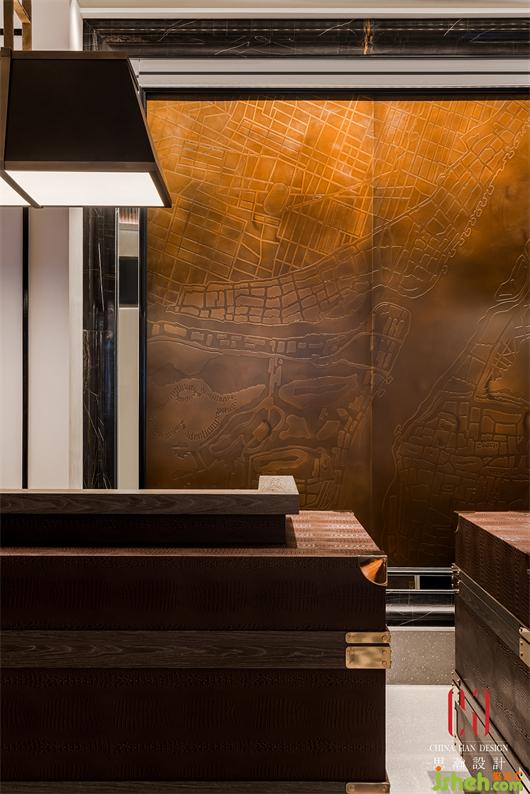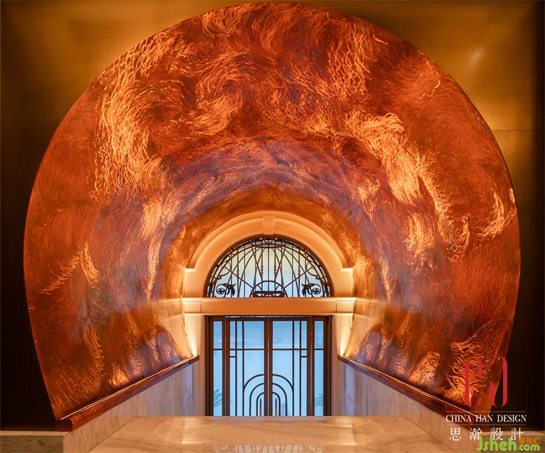 金光燦爛的黃銅表皮花紋肌理打磨制作的奢侈,抓住了人們的視線。經(jīng)過各項考慮上選擇重金屬類的黃銅板詮釋,黃銅結(jié)合手工藝去做拋面,并以大曲面的方式讓銅面不只是一般的金面,更有紋理與肌理,在墻面上更注重細(xì)節(jié)不做多余的焊接,在光線與銅面反射下,空間彷佛也是雕塑品。