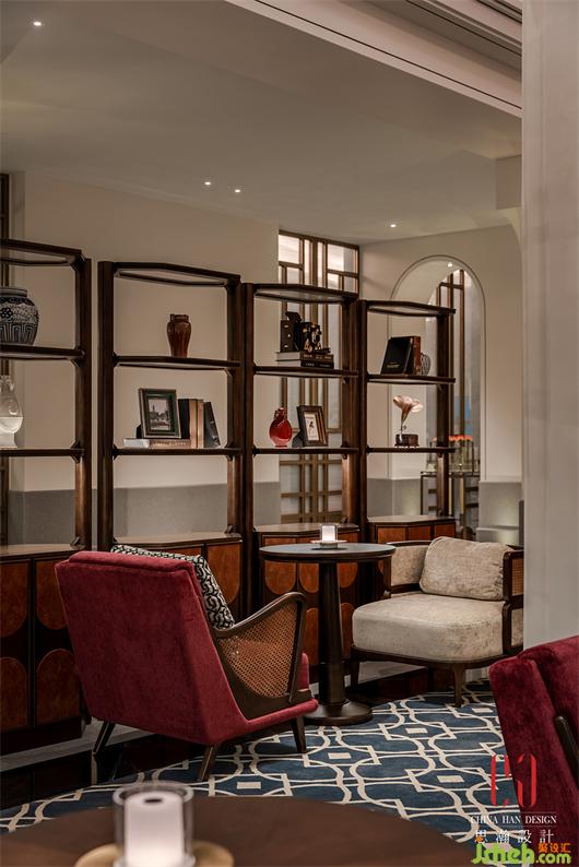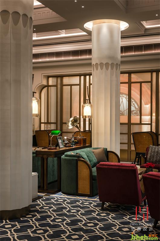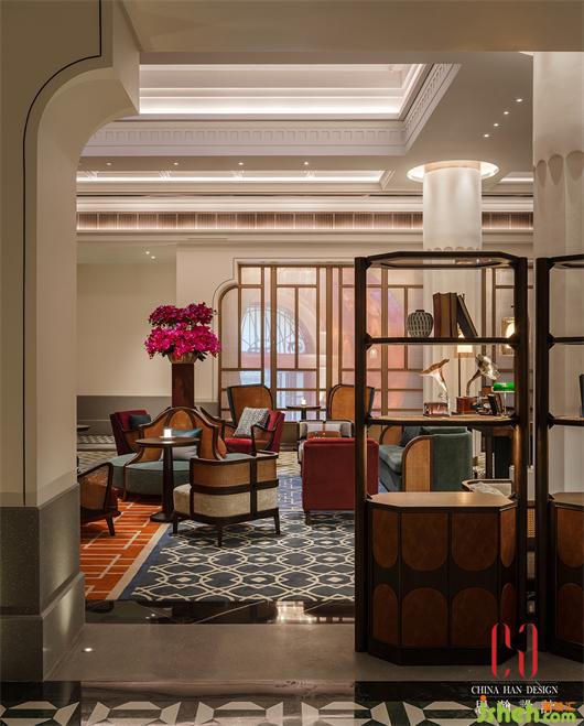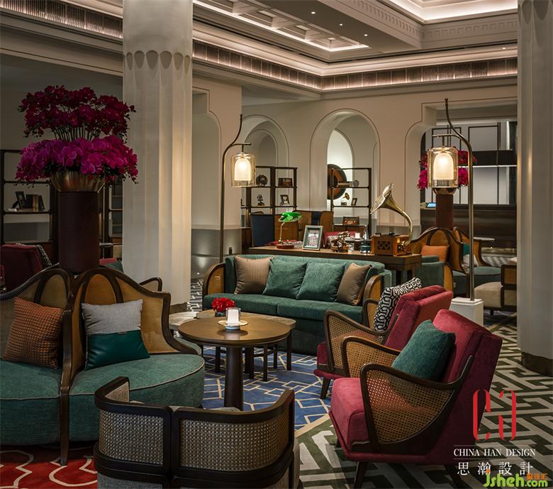 自由圍合的沙發(fā)和藤椅,國際酒店設(shè)計配合明度和飽和度偏低的紅色、綠色靠墊以及各種窗楞格紋的地毯,搭配充滿宮燈、老照片、將軍罐、唱片機(jī)等充滿城市記憶的物件,民國風(fēng)情撲面而來。