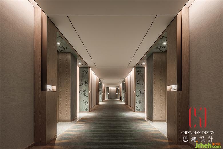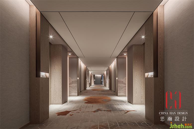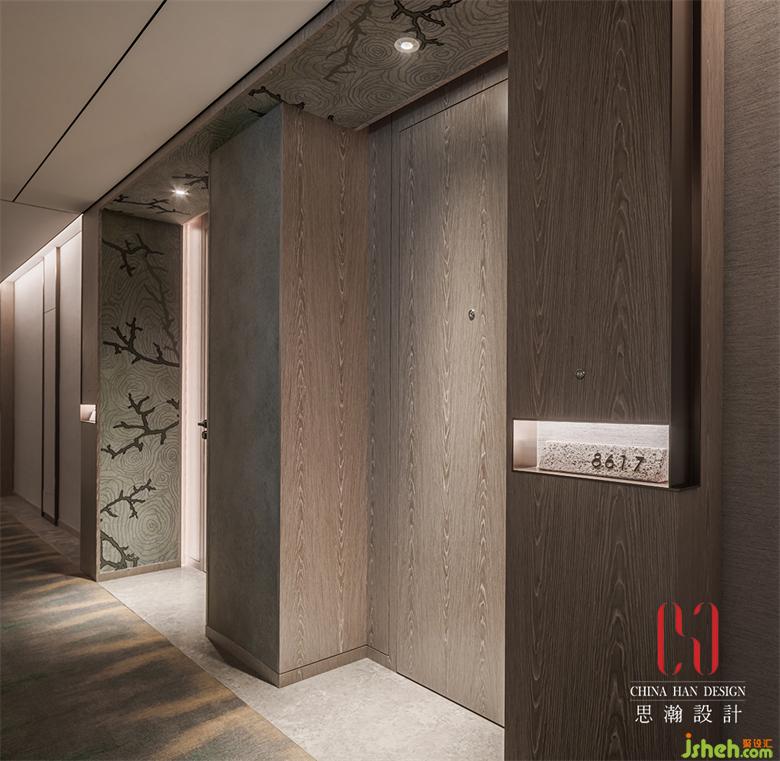 光線通透的電梯廳依然延續(xù)著金屬飾面與米白色墻面的組合,大氣而優(yōu)雅。端景處竹節(jié)造型的瓷片像素畫渲染出西海山水的群山風(fēng)貌。