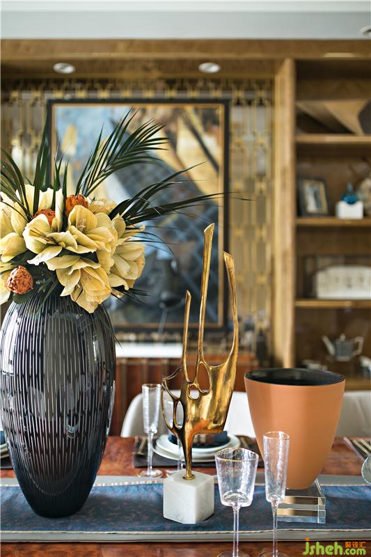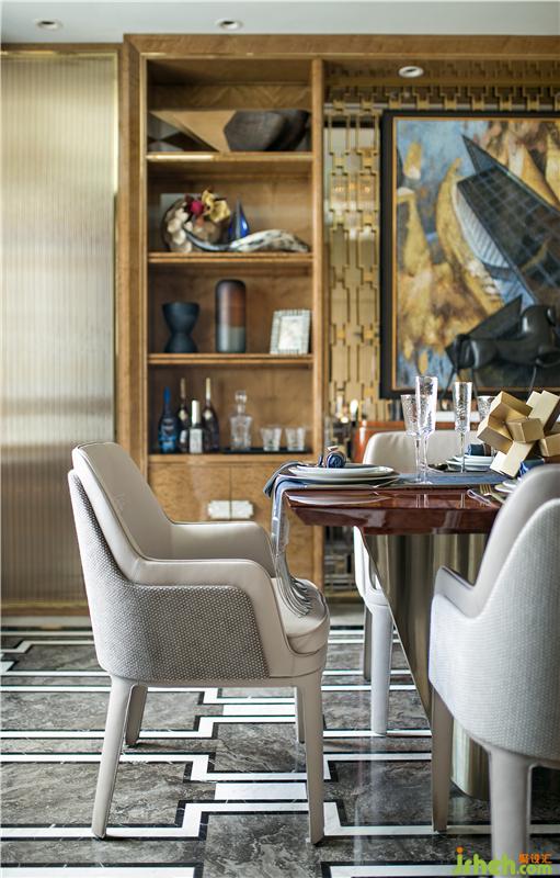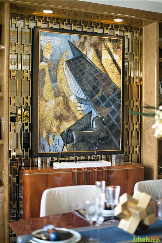 對稱的高檔壁柜,為主人提升了空間的格調(diào)與奢華感;用餐不經(jīng)意間的抬頭,就能看到印象派城市的掛畫與Ralphpucci的餐邊柜,更加享受風(fēng)雅怡然的就餐氛圍。
