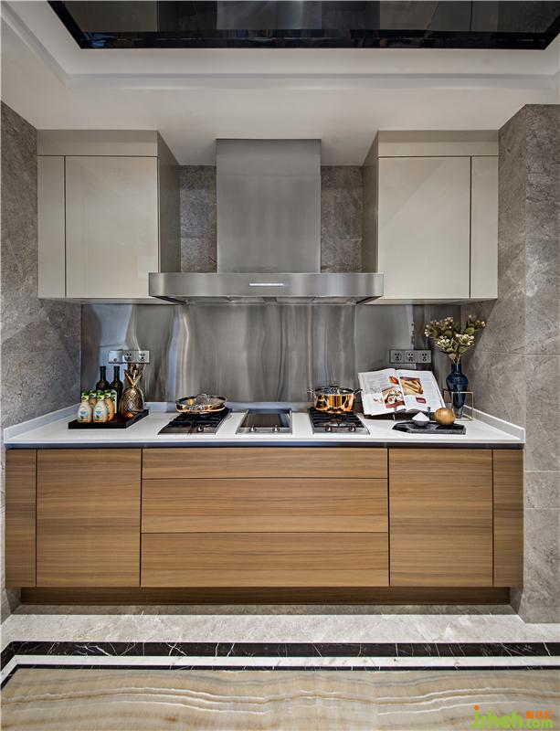 大理石墻面搭配拉絲不銹鋼面板抽油煙機(jī),降低了空間的反射度,空間沉穩(wěn)含蓄,巧用墻面空間的對稱吊柜,可以收納,也可以增加喜愛的裝飾品元素,又實(shí)用又美觀,讓下廚過程中所需之物都隨手所得,白色大理石臺(tái)面與原木色柜體的搭配,更添立體感和質(zhì)感,賦予了廚房一種摩登時(shí)尚的力量。樣板房設(shè)計(jì)