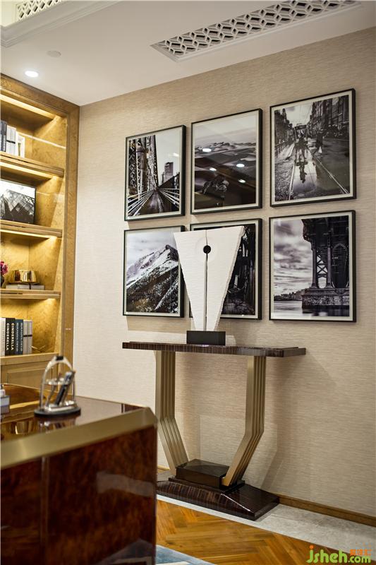 貴族人士喜歡的高檔樹瘤飾面,張揚(yáng)而不喧嘩,實(shí)木地板與書柜書桌成一體,更具沉靜的獨(dú)立思考空間;踩著時(shí)尚幾何線條的寶石藍(lán)地毯,那是熱愛是藝術(shù)的生活態(tài)度。樣板房設(shè)計(jì)