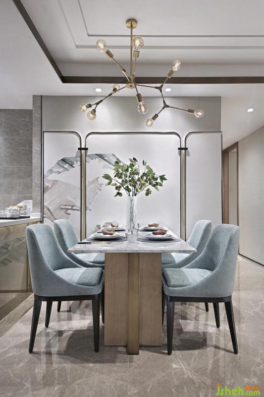 餐廳采用抽象山水屏風做為背景墻,從視覺上輕松劃分區(qū)域,同時把中式元素以一種潤物細無聲的姿態(tài)置入其中。餐廳選用較為現(xiàn)代的材質,以大理石為臺面、木質與金屬為框架,搭配萬古青色調的布藝餐椅,讓現(xiàn)代與中式和諧共生。
