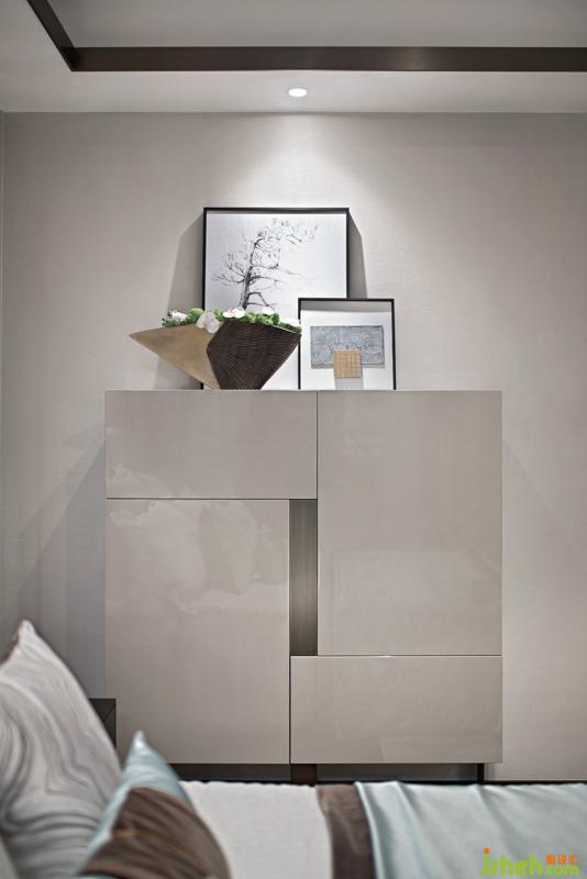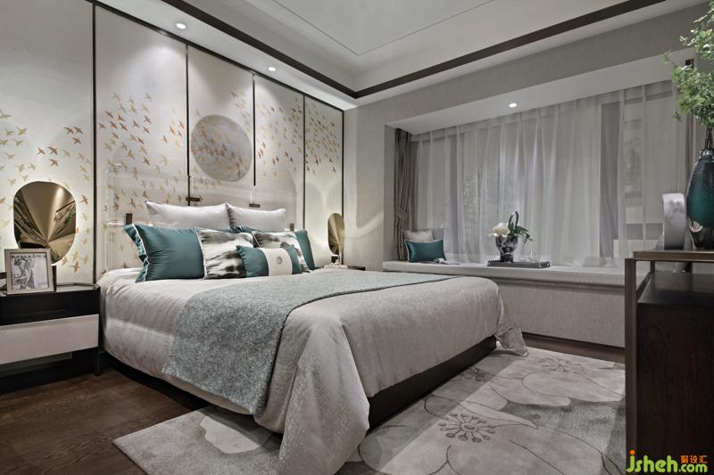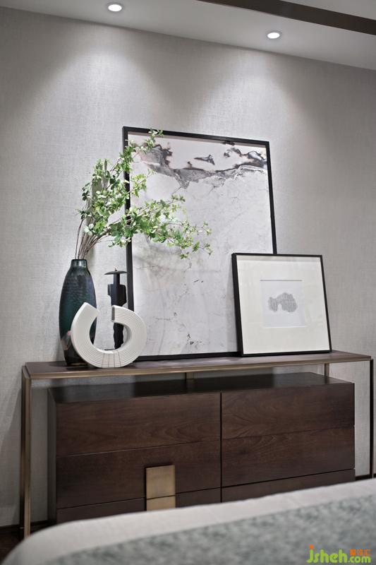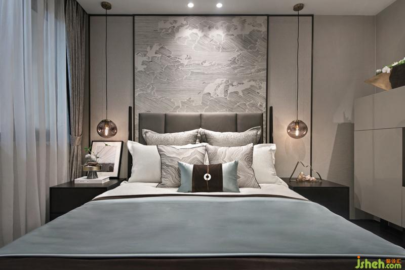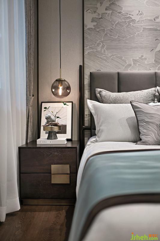 作為熱愛中式文化的主人公,主臥室是一個重要的呈現(xiàn)空間,在背景墻的大雁墻紙與山水圖紋抱枕的相互呼應下,設計師再將金屬臺燈作為點睛之筆置入空間中,同時搭配一束生機勃勃的綠植,展現(xiàn)出一個韻味悠長空間。樣板房設計