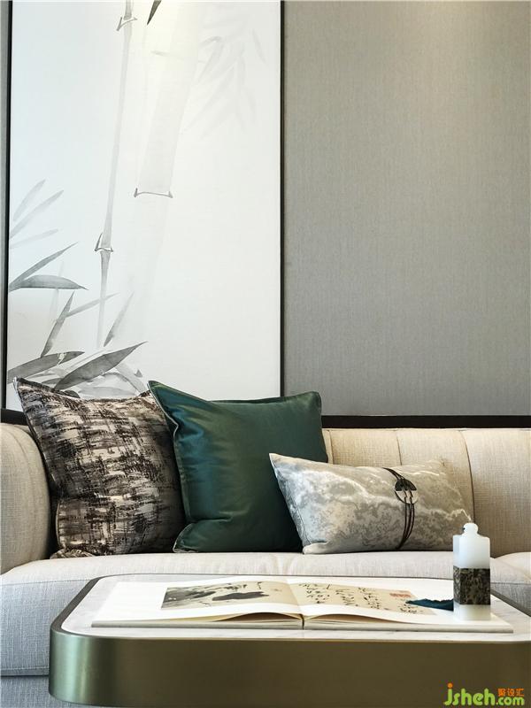 蘇東坡有詩云:“寧可食無肉,不可居無竹?!币环惺斤L(fēng)情的水墨竹背景裝飾畫點(diǎn)綴整個(gè)空間的古典氛圍,沙發(fā)上的抱枕,幾番顏色雕琢便勾勒出一番“日光穿竹翠玲瓏”之境。