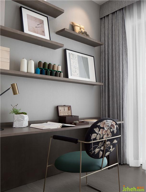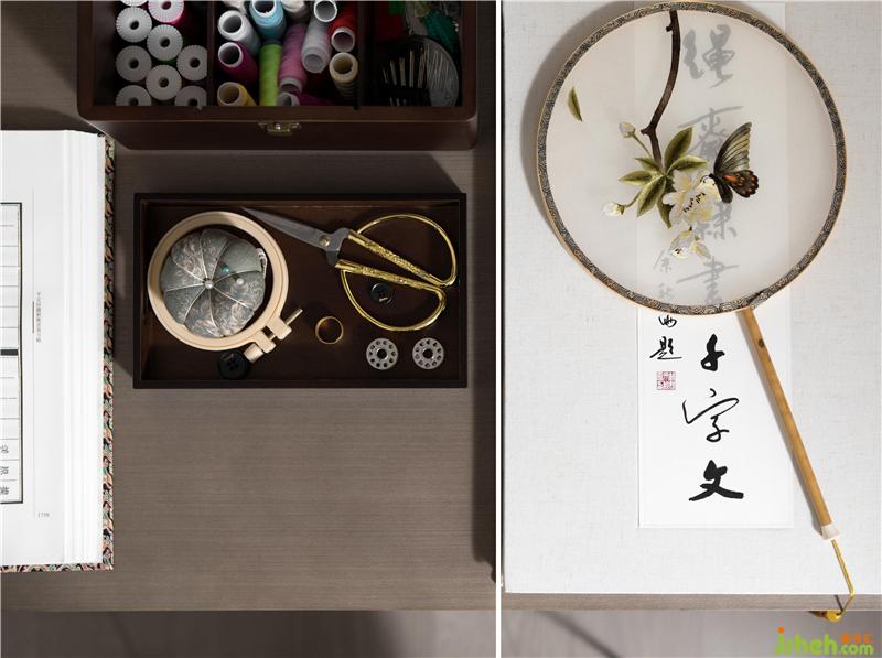 設計師將中國民族特色文化往家居文化設計方向延伸,書房空間兼顧工作室,女主人對粵繡頗有研究,閑暇之時即興創(chuàng)作,一針一線,巧思細酌,將傳統(tǒng)手藝傳承的同時又賦予其新生的力量。