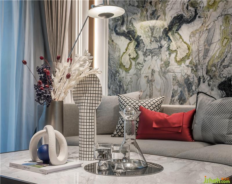 客廳功能集休閑、會(huì)客、娛樂等為一體,采用各種材質(zhì)、色彩、形制合奏出獨(dú)特的藝術(shù)氛圍。在色彩上沿用整體硬裝的基調(diào),加入了時(shí)尚紅和群青色,感受來自米蘭的時(shí)尚氣息。