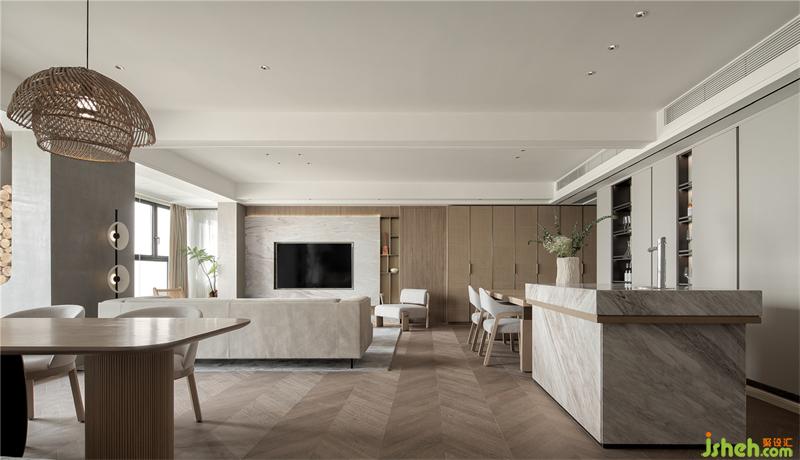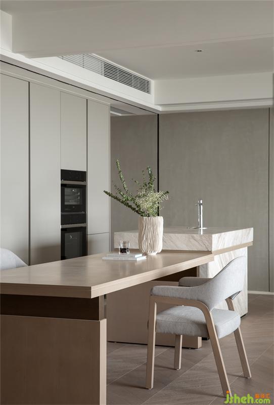 在這個空間里,原木色餐桌和大理石西廚吧臺融為一體,干凈線條的家具和空間自然元素碰撞,你會發(fā)現(xiàn)這是一種非常有趣的結(jié)合,空氣中飄散著回歸自然的舒暢,空間里達到一種奇妙的平衡。