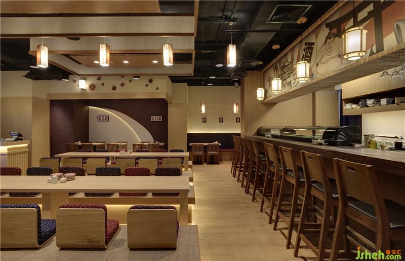 門面結構是原本已構架好的,作為商場基礎設施的一部分,是不能改動的落地玻璃。缺點是雖然看起來通透寬敞,但過于一目了然。因此在設計過程中,在玻璃后方加入了和門面頂端相呼應的淺色木條做出視覺屏障來解決此問題,營造更貼近溫暖氣氛的居酒屋。餐廳設計
