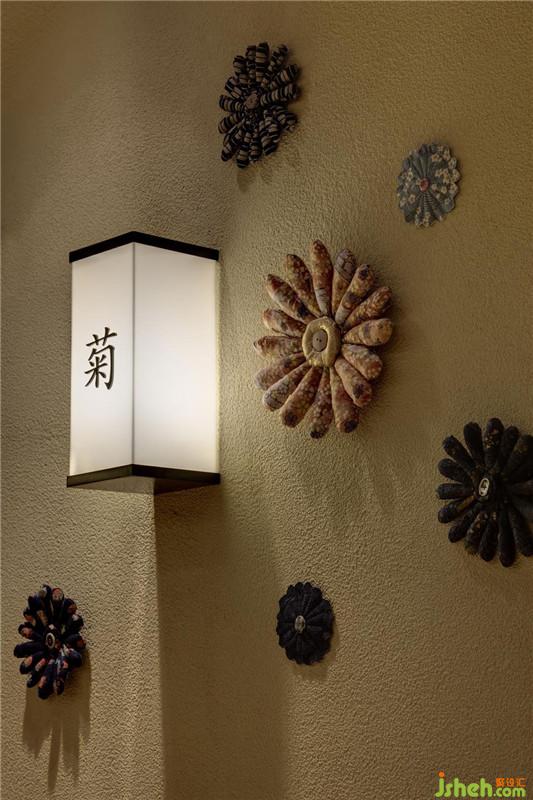 廂房的外墻上涂有特殊粗面材質漆料,墻面上不同形狀大小的手制工藝則由日本手工大師用和服布料,通過立體剪裁縫制完成,在燈管照射下,別有風味。餐廳設計