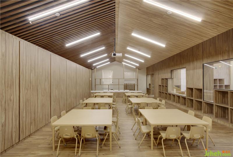 將一半的天花設(shè)計為木質(zhì)柵格狀以配合空調(diào)通風(fēng)系統(tǒng)。考慮到孩子們的視力健康,設(shè)計師選用了柔和不刺眼的內(nèi)嵌式燈管來照亮整間教室。