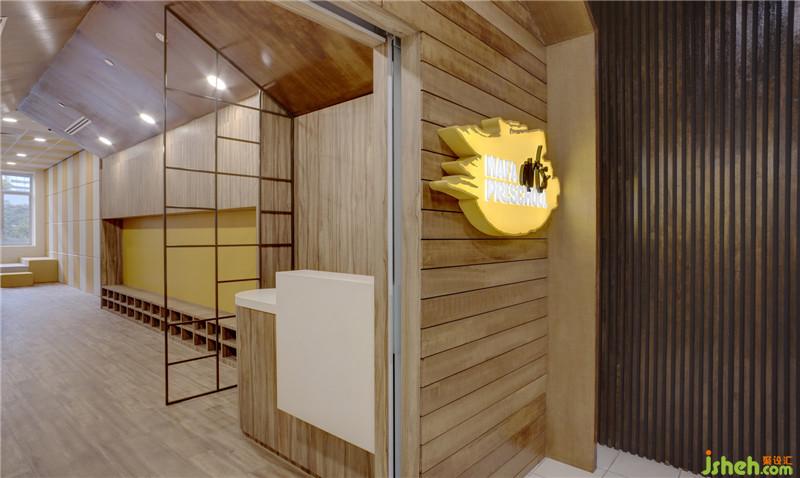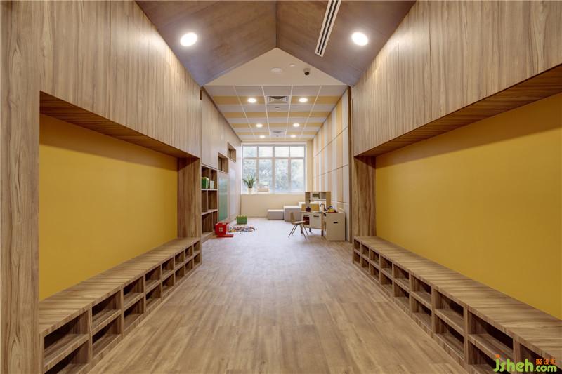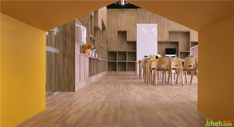 首先,設(shè)計師使用了簡單干凈的木色來作為整個設(shè)計的主要顏色,并用木質(zhì)材料取代瓷磚和涂料。孩子們可以赤腳奔跑在木質(zhì)的地板上,在無形之中向孩子們傳達(dá)低碳,綠色環(huán)保的教育理念。室內(nèi)設(shè)計師