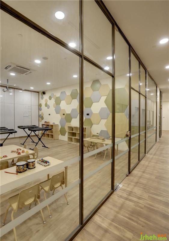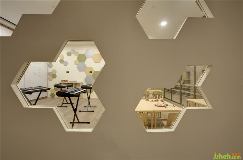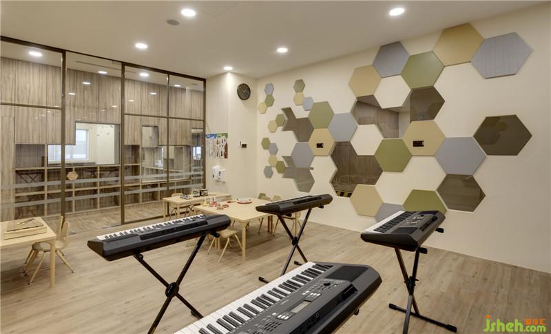 在音樂教室的墻面設(shè)計(jì)了三種不同由六邊形由三種顏色的六邊形組成,有青春朝氣的綠色,積極向上的黃色和象征平緩安靜的灰色。運(yùn)用這三種色彩的淡色系,給孩子們帶來(lái)舒緩,放松的效果。室內(nèi)設(shè)計(jì)師
