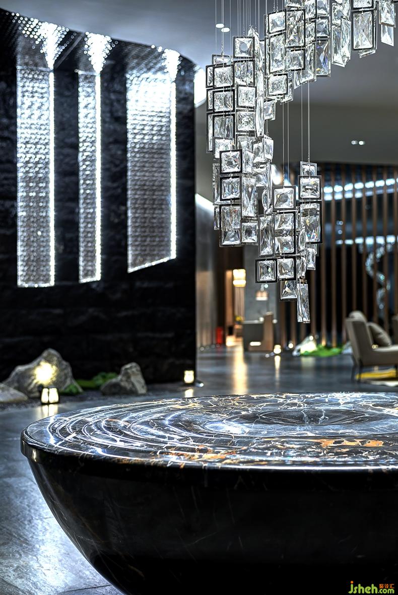 接待處正中心,晶瑩剔透的水晶裝置大燈似寶石項(xiàng)鏈一般懸垂而下,漣漪圓盤使用黑金花大理石,顏色醒目。裝修設(shè)計(jì)大廳背景墻大理石肌理自然延伸,演繹純天然的原生態(tài)之美。配合上燈帶,柔和了石材與木帶來的視覺沖擊。
