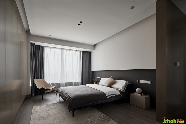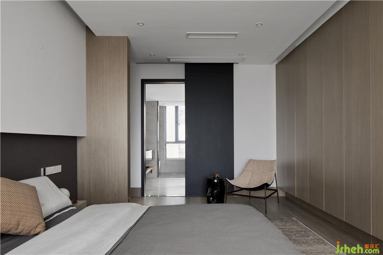 主臥室室內(nèi)設計師重新調(diào)整結(jié)構(gòu)布局,利用臥室較大的進深,弱化了衣帽間的設計,增加了隱形衣柜,既實用又美觀。