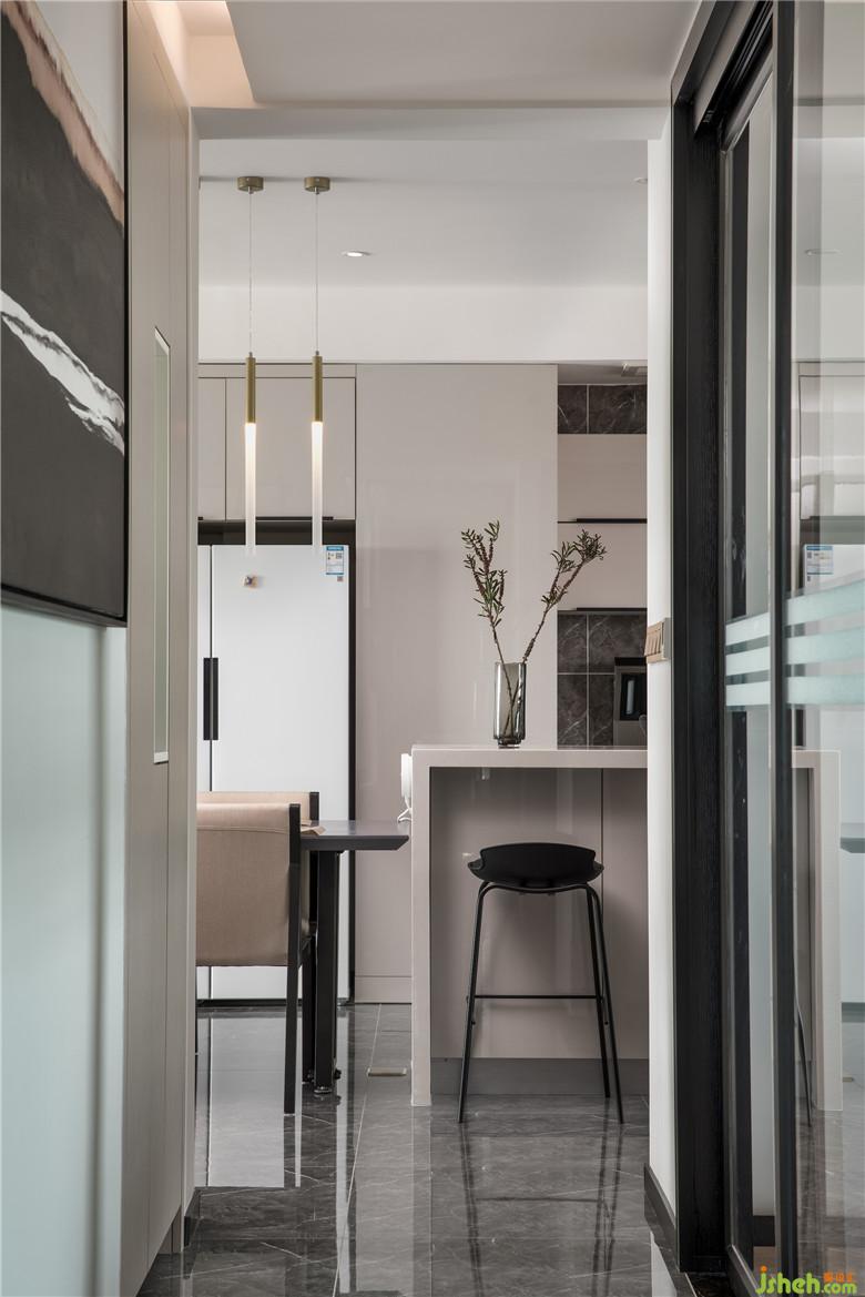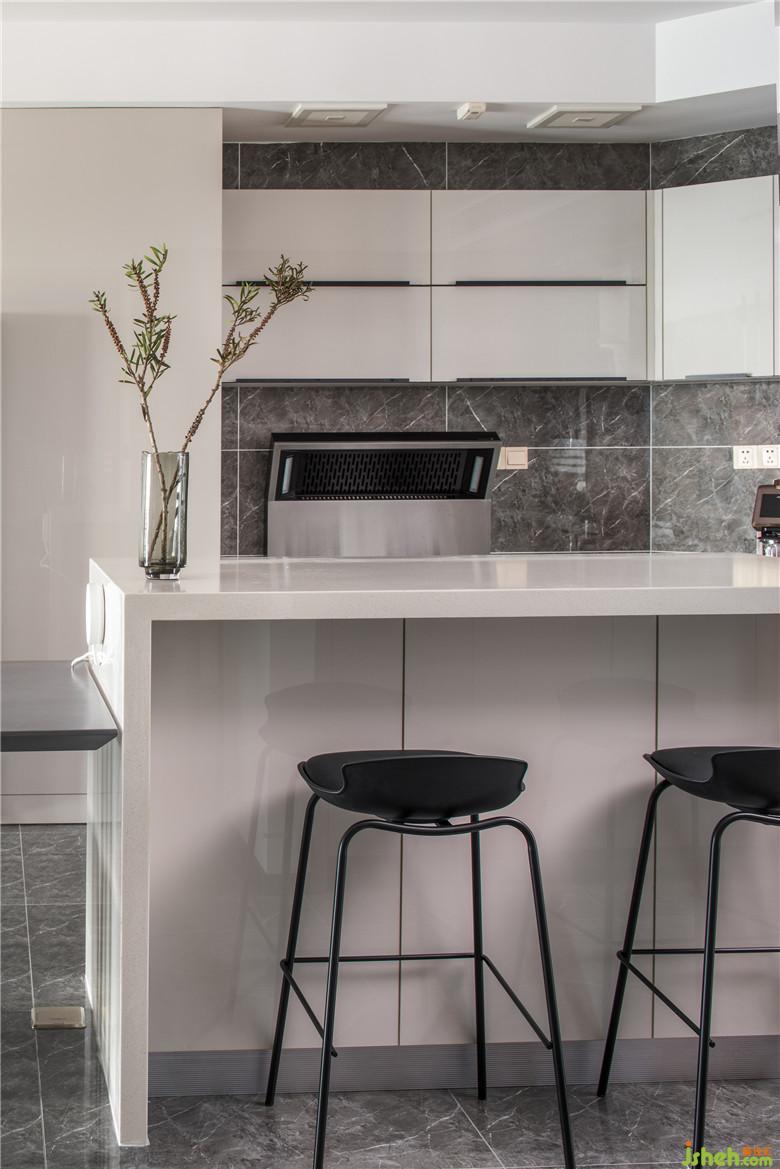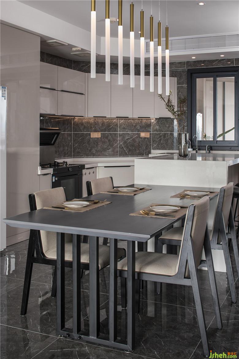 原來的廚房沒有什么采光,室內(nèi)設(shè)計(jì)師在布局上考慮了開放式廚房加島臺(tái)的操作形式,客餐廳做在一起增加了公共空間的面積也為屋主增加了更多的活動(dòng)空間。將廚房的洗手盆考慮在靠窗的位置增加采光的同時(shí)也方便使用。