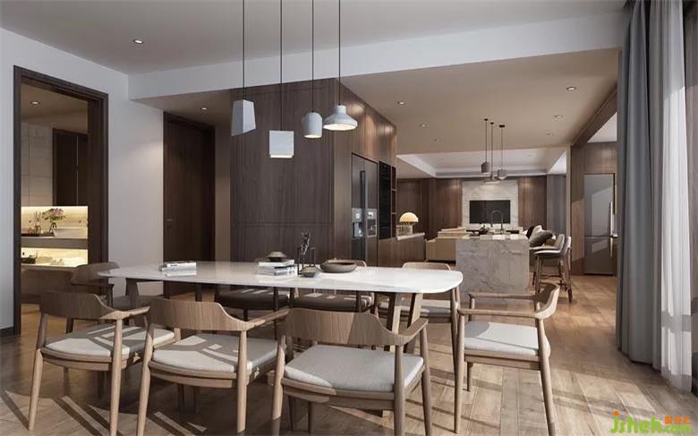 室內設計師將原來廚房打通,變成兩個空間的過渡,在此空間考慮吧臺,滿足自己西廚的功能,也滿足日常家庭聚會社交的需要。