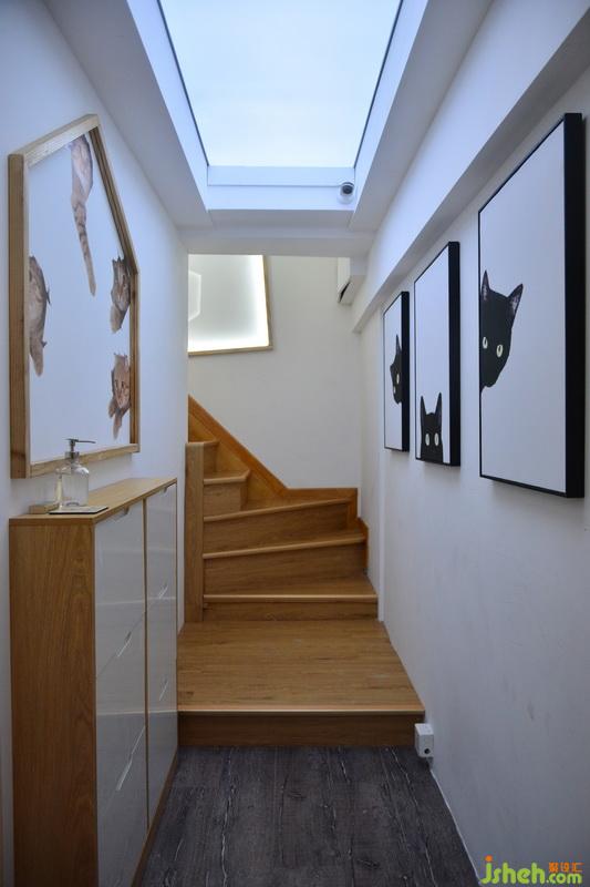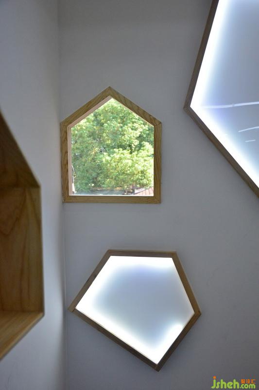 鏟屎官們上樓的場所也毫不意外的成為了貓主子們玩耍的地盤,在墻面上采用貓窩的形象,塑造大面積的光源。同時對原有的玻璃窗進(jìn)行改造,創(chuàng)造一個形制一致的墻面效果