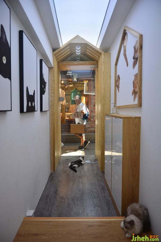 調(diào)整了原始陡峭的踏步,增加臺階,保證鏟屎官們體驗的安全性。在入口區(qū)設(shè)置免洗洗手液及拖鞋,保證鏟屎官們在進(jìn)入擼貓館之前病菌被消滅。同時設(shè)置墻壁上的畫作作為游客自拍點。