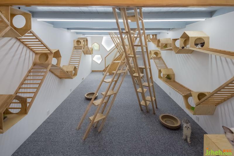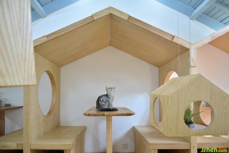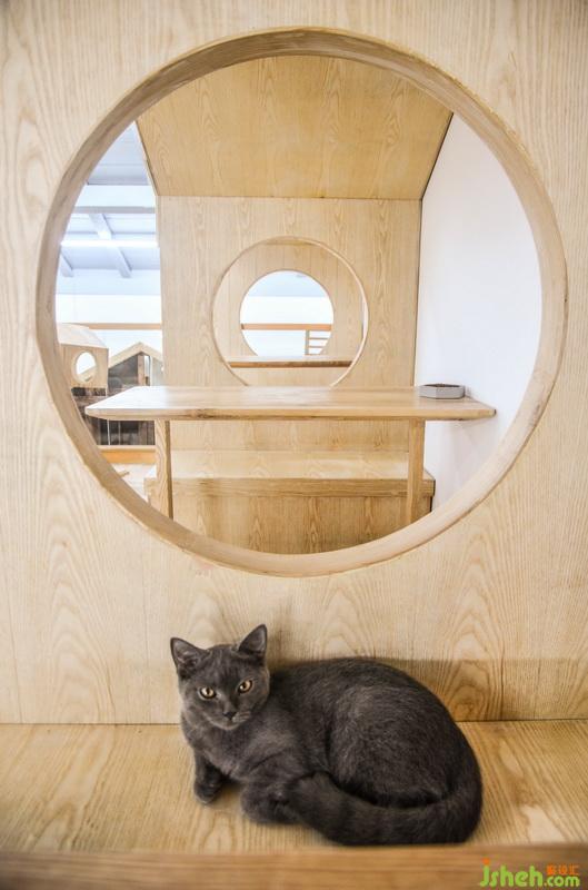 室內(nèi)設(shè)計師在三層休息區(qū)設(shè)置屋形固定座位,供客人們更加舒適的擼貓。同時在座位之間設(shè)置圓形洞口,保證主子們的來去自如。