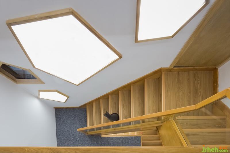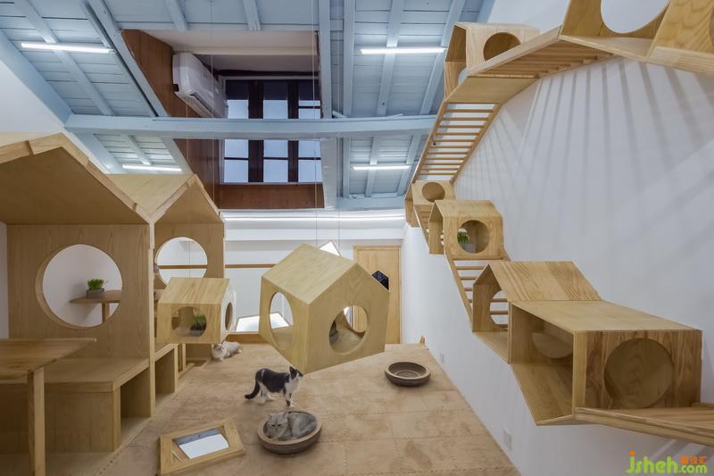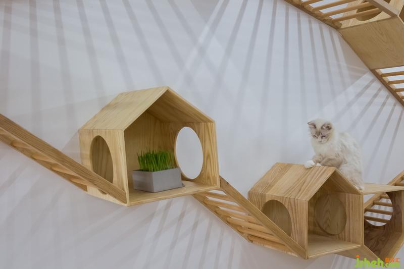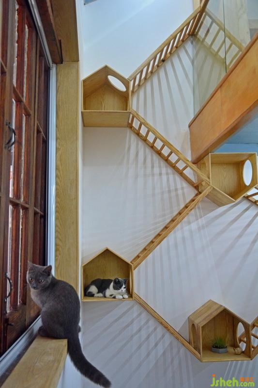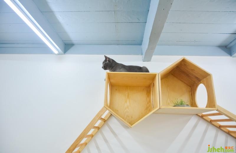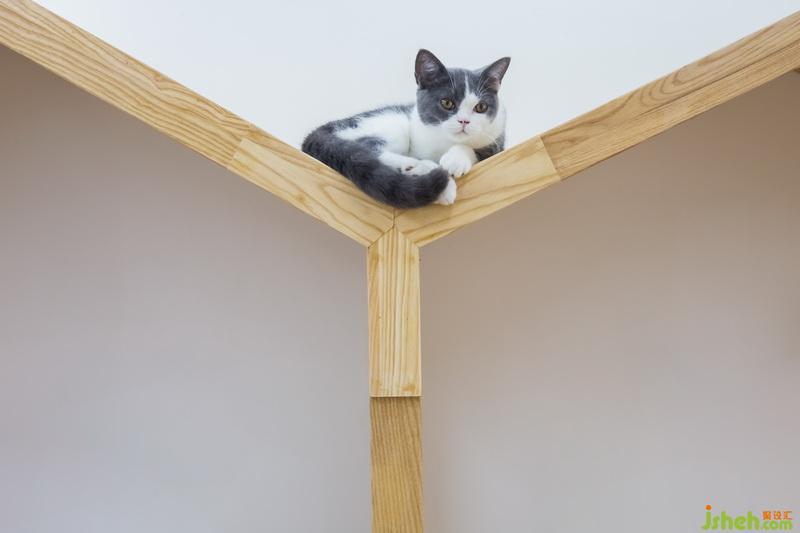 屋形的貓窩通過開洞和貓爬架相互串聯(lián),在墻面上形成一整片活動區(qū),使得貓咪們可以自由玩耍探索。貓爬架形成的特殊光影,也為貓咪們提供了新的趣味。