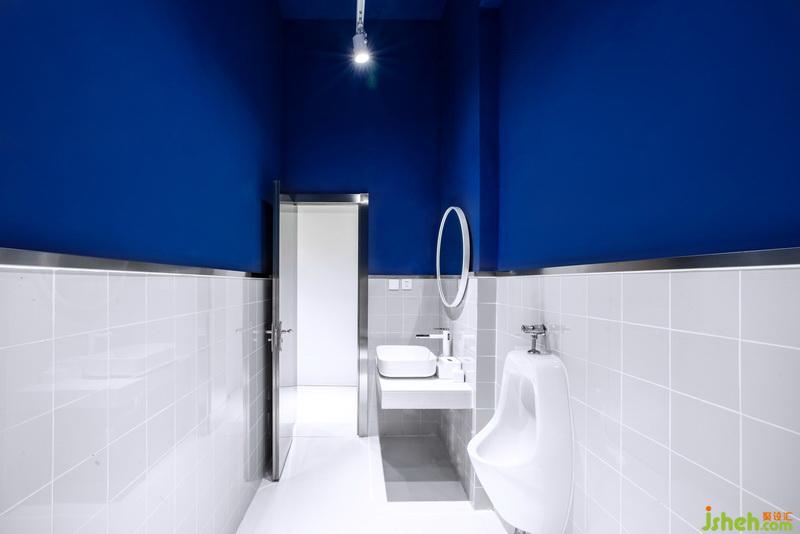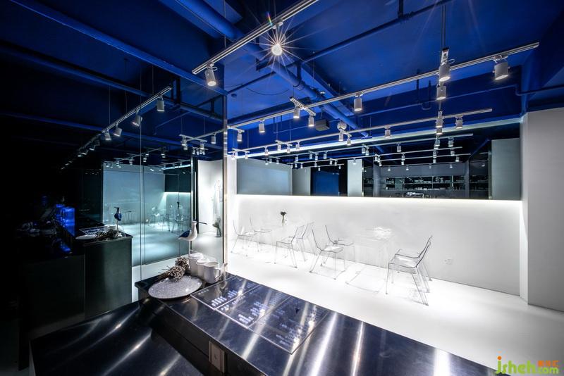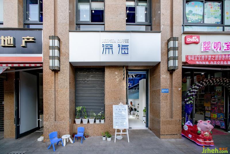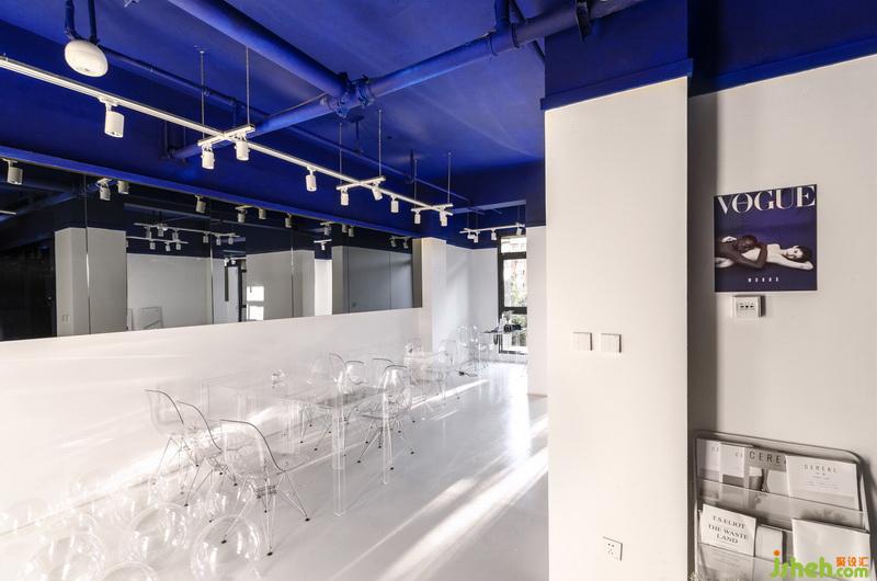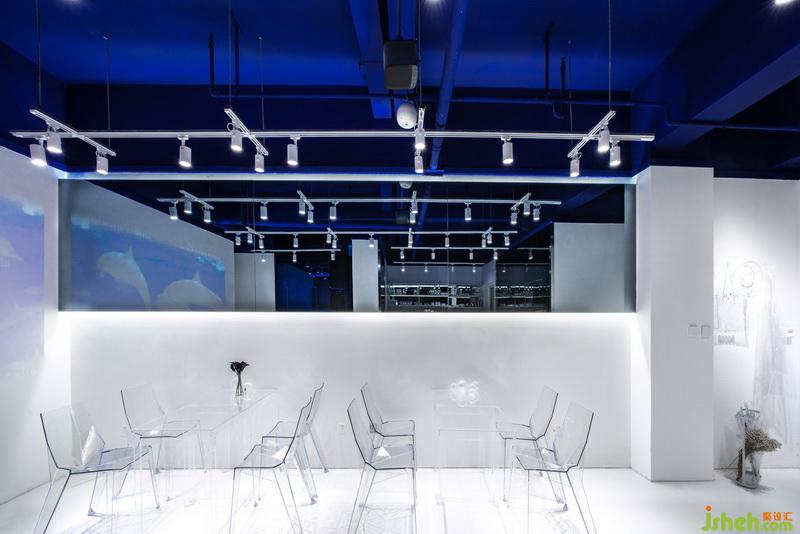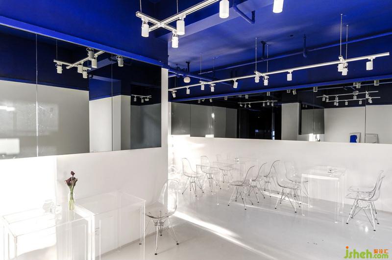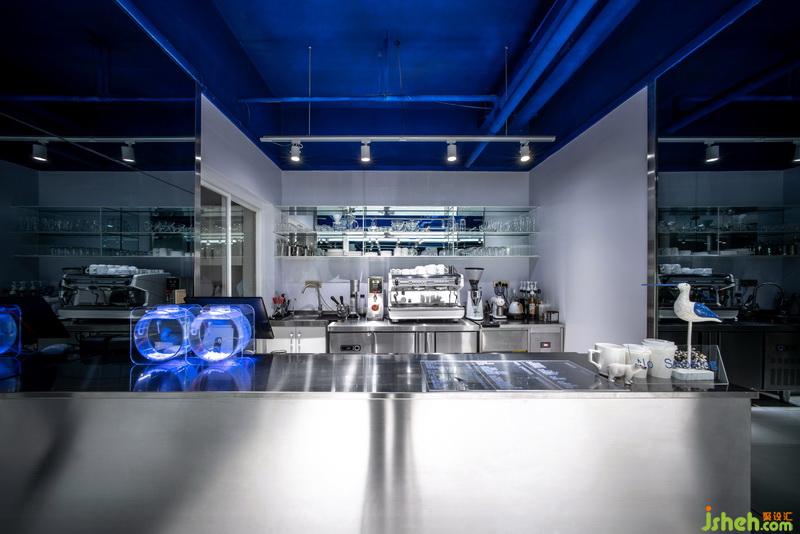 因為業(yè)主確定咖啡館名字叫“深?!保栽O(shè)計師花了心思去思考到底“深?!笔鞘裁?。不同于常規(guī)的思考和正常做設(shè)計時搜索參考圖片的是,往往這樣的設(shè)計都是帶有藍(lán)色的空間,但“深?!边@個名稱所帶來的概念思考卻是,為什么深海是藍(lán)色的?當(dāng)透過這層思考方式去搜索就會發(fā)現(xiàn),海水之所以是藍(lán)色,是因為天空是藍(lán)色的(原理就不多說了),水體(空間)是透明的,所以深海的藍(lán)色是光和材料本身所產(chǎn)生的而非通過“設(shè)計”創(chuàng)造的。帶著這樣的邏輯,整個空間的設(shè)計就很明確了,拆除原有的吊頂,用涂料做成藍(lán)色的“天空”;下面的空間則使用帶有反射性/透明性的材料——鏡面、金屬、亞克力、塑料等,通過這種曖昧的委婉的,而非簡單粗暴的方式,讓深海的藍(lán)色充滿整個空間。