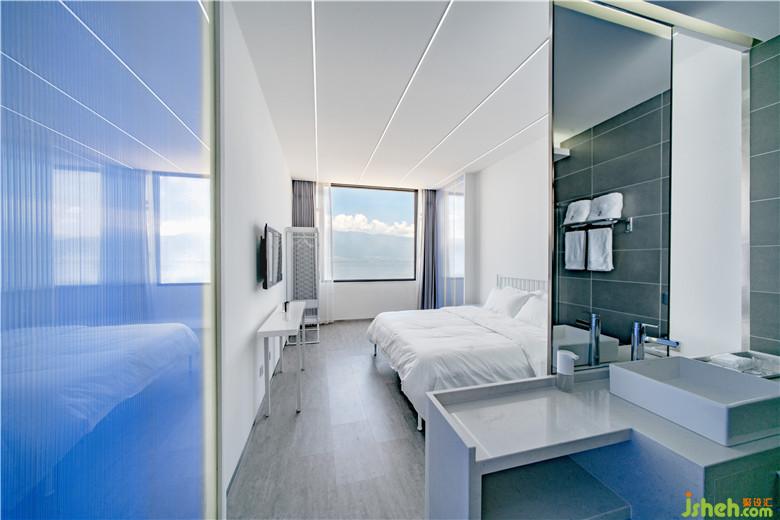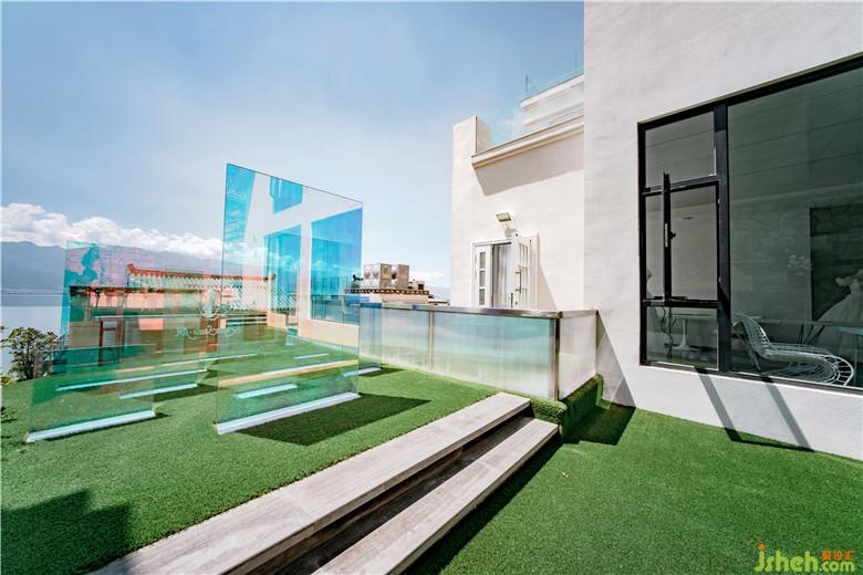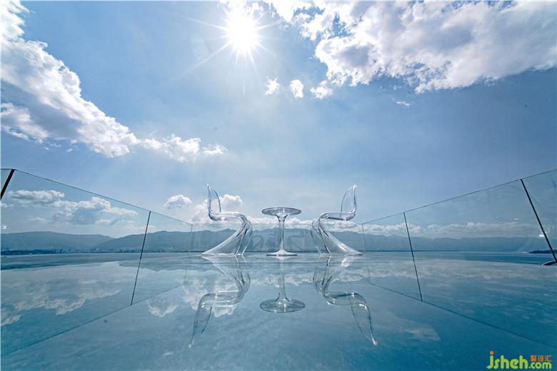 屋頂露臺(tái)主要為拍攝所用及享用下午茶的絕妙之處。遠(yuǎn)處的洱海在玻璃的反射下,天光湖水共一色,人仿佛懸在空中,享受人間這一灣清澈的湖水。整個(gè)臺(tái)面只在中間區(qū)域做了鏡面,而沿露臺(tái)有完整的一道水面去反射天光,深黑的池底與水面形成的反射,同鏡面形成的反射有著微妙的差異,鏡面,水面,洱海與天空,四個(gè)不同的景色同時(shí)起舞形成特別的休閑環(huán)境。