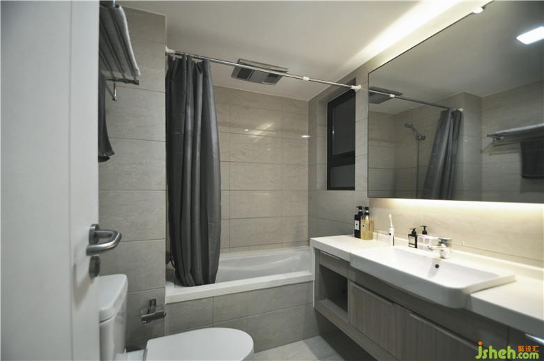衛(wèi)生間在業(yè)主要求下安裝了浴缸和大面的鏡子。嵌入式水盆便于清潔,長(zhǎng)臺(tái)面增大使用區(qū)域。
