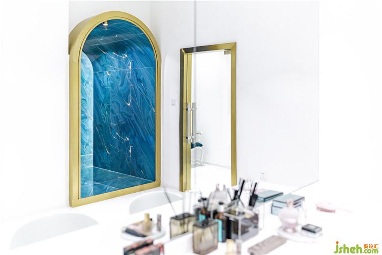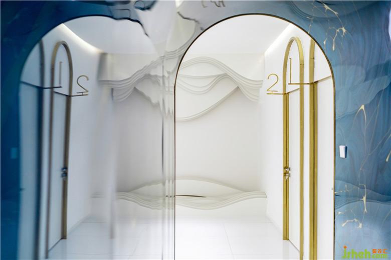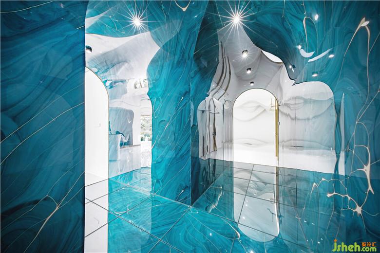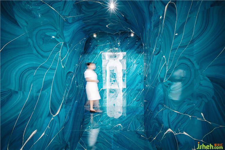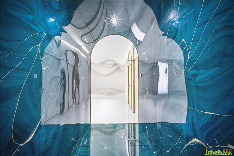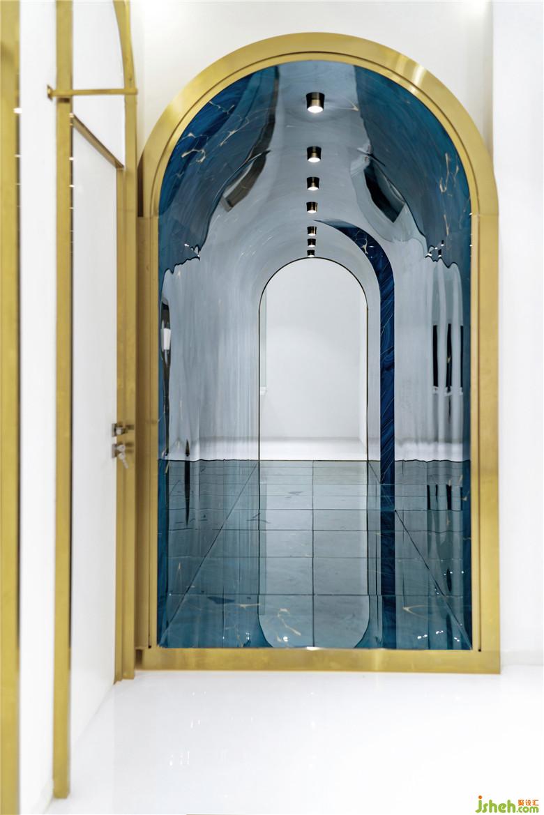 空間選材上,整體運(yùn)用白色木飾面、乳膠漆等作為空間基調(diào),仿古銅拉絲不銹鋼、水晶板、淺灰原木等作為點(diǎn)綴?!癟”形通道則采用弧形拱頂,并在墻、頂、地三面上都統(tǒng)一使用藍(lán)色的水晶亞克力板來(lái)打造“深水冰窟”的沉浸式體驗(yàn),使得空間充滿視覺(jué)張力。二者不論在色彩還是形式上都形成鮮明對(duì)比,從而突出強(qiáng)調(diào)了“秘境”通道的獨(dú)特沖擊力。