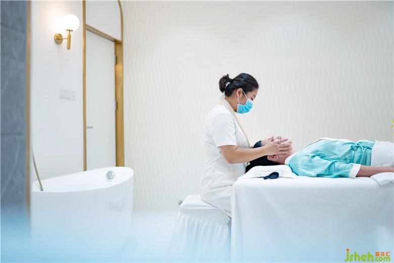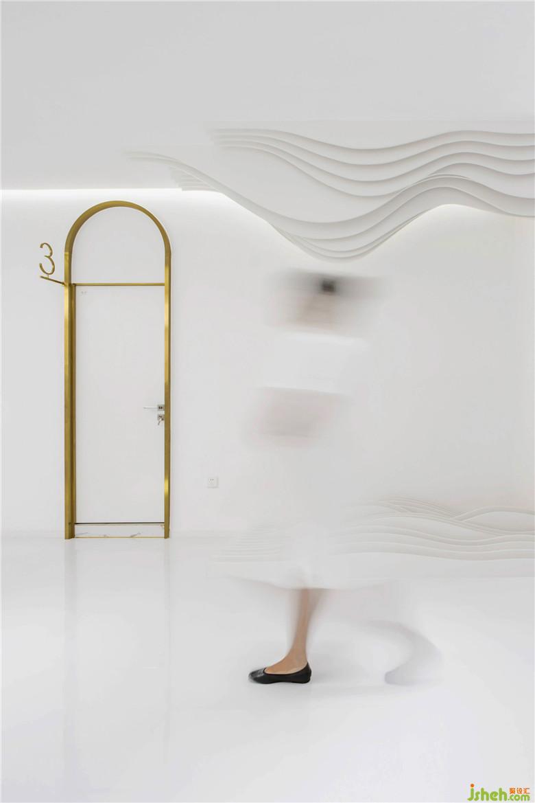 客人由入口至大堂接待區(qū),而后穿過(guò)藍(lán)色的通道開啟她們的美麗旅程——依次先穿過(guò)通道在等候區(qū),進(jìn)行膚質(zhì)等等的檢測(cè)和美容問(wèn)題的咨詢,而后穿越一次通道進(jìn)入休閑區(qū),護(hù)膚理療休憩功能一應(yīng)俱全,客人能在這里舒適地享受護(hù)理服務(wù)、交談、茶座等,寬敞的休閑區(qū)還未沙龍、講座的公共行為提供了可能性。三處空間私密性遞增,通道則是不同功能與空間畫面間的轉(zhuǎn)場(chǎng)。